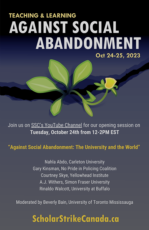 The racist, colonialist and capitalist society we live in is currently based on the social abandonment of many people including unhoused and poor people; Black, Indigenous and racialized people; migrants; those affected by Covid; people with disabilities; trans and queer young people; sex workers, drug users, precarious workers; low-waged workers; international students and many more. State policies and police attacks are central to social abandonment which take place in society more generally, globally and in the post-secondary worlds. While much of the post-secondary world is directly involved in these forms of social abandonment, they are also sites of resistance to social abandonment. This is what Scholars Strike Canada is building on in this session and these teach-ins. Panelists linking the broader forms of social abandonment to what is going on in the universities and colleges will describe what social abandonment is and how we are fighting against it.